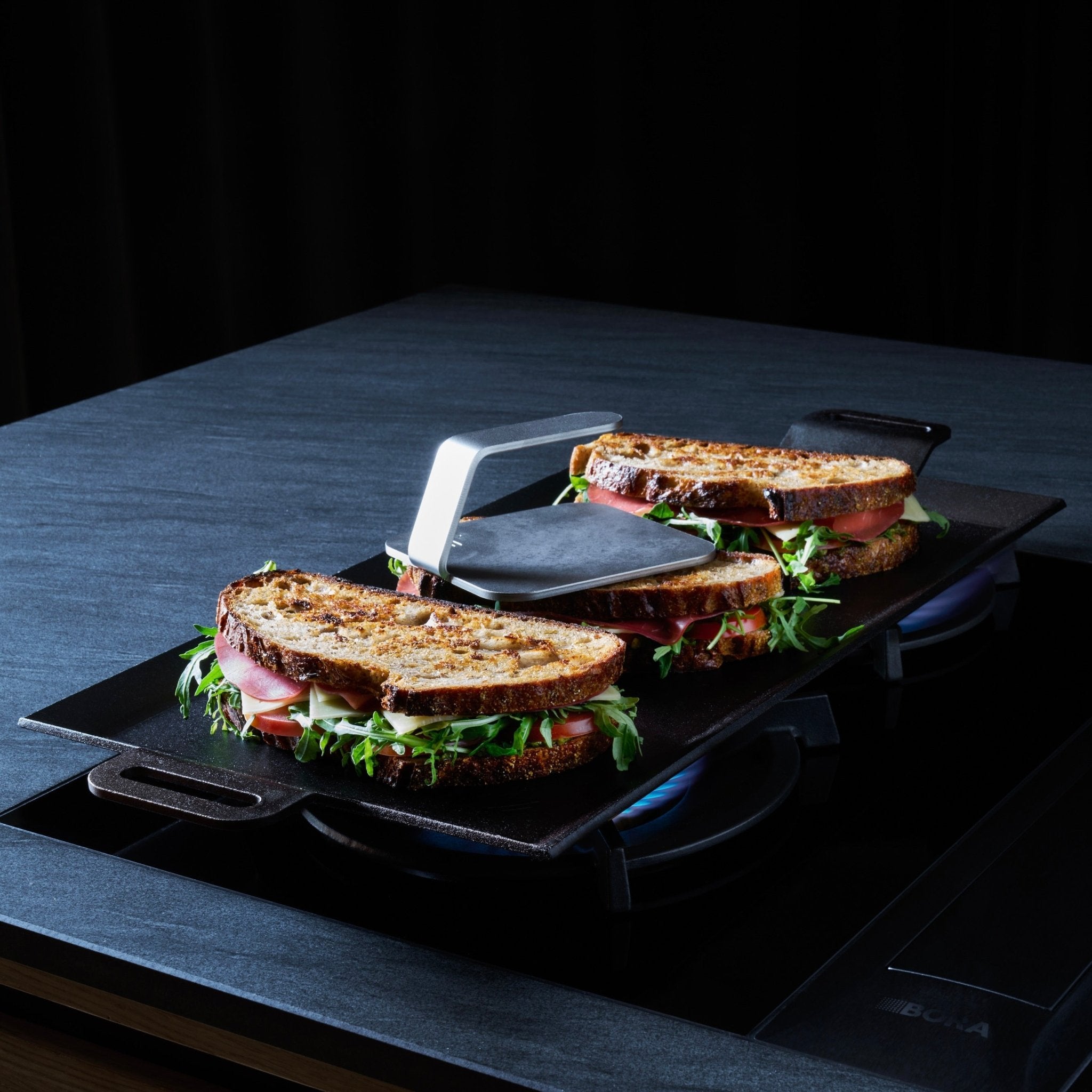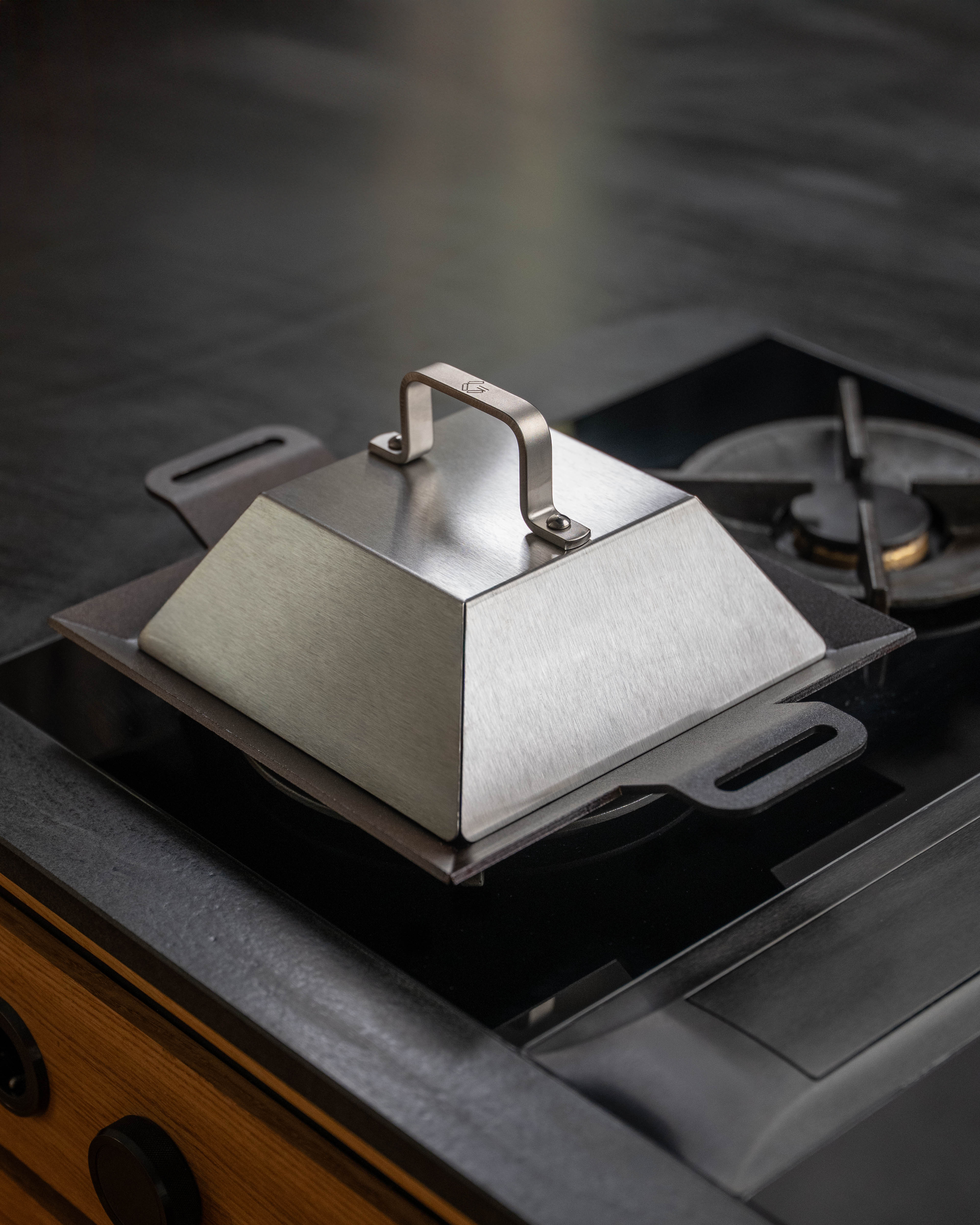 A smasher or grill press is a great accessory for your griddle. By using a smasher, you can press your steaks flat for even cooking and a delicious, crispy crust. The smasher can also be used to press sandwiches or paninis. Our carbon steel griddle is robust enough to handle the pressure of a smasher, so you can ensure optimal cooking surface.