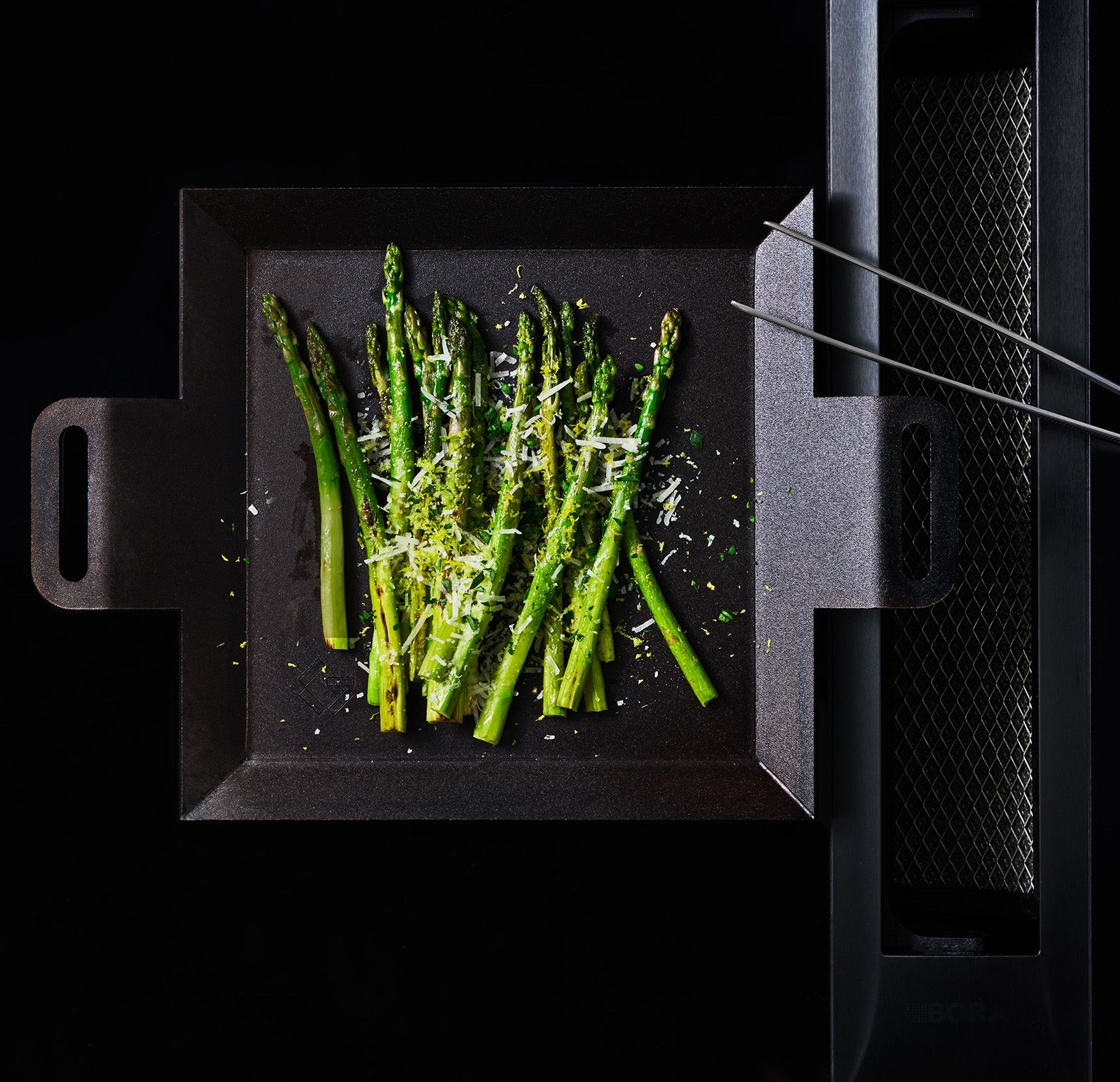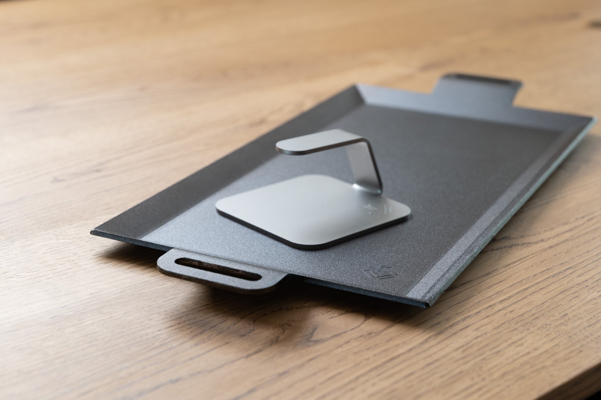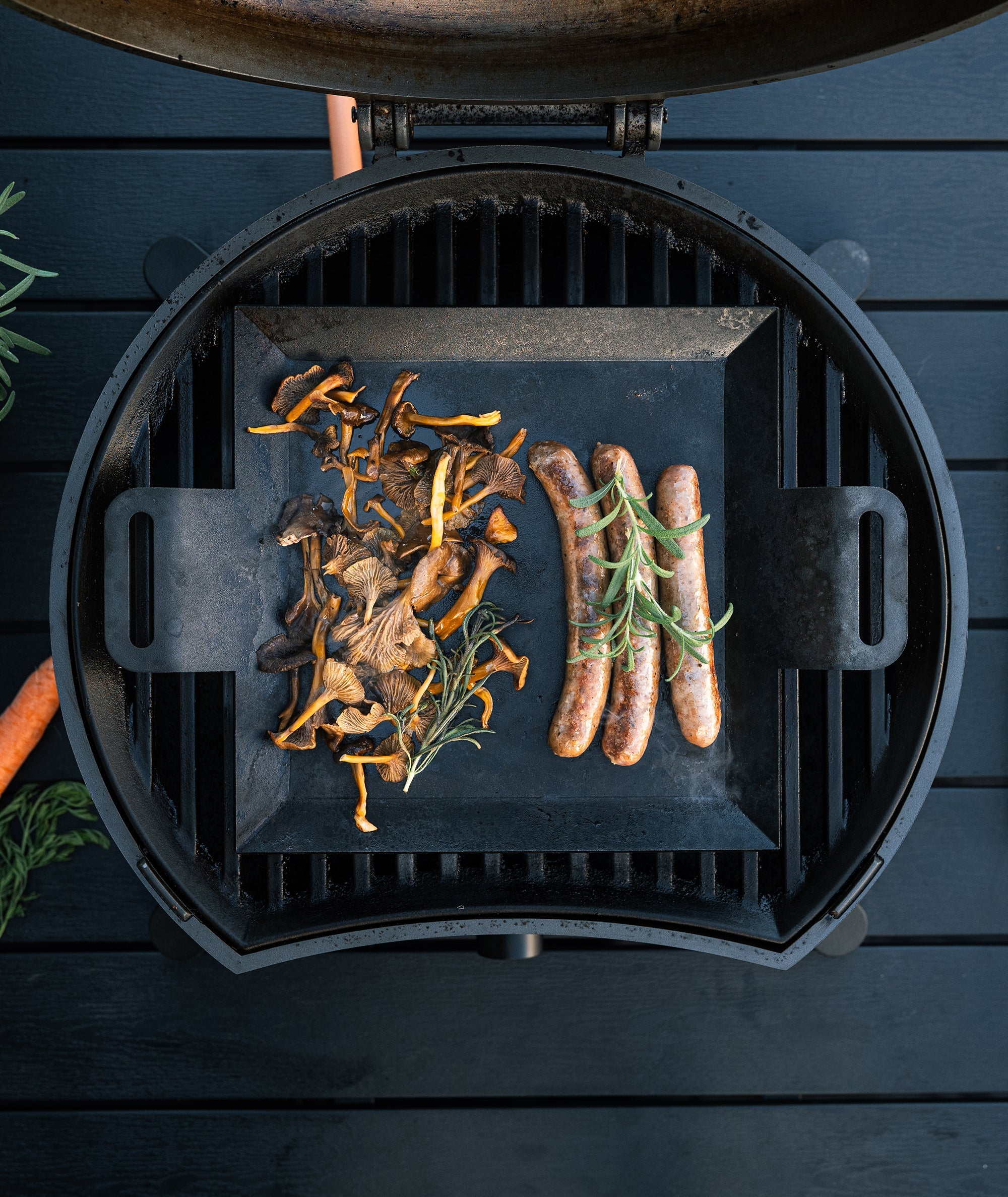 Our griddle is made in Sweden in collaboration with a company with more than 100 years of tradition behind it. The carbon steel is pressed into the unique design. Once the shape is in place, the entire griddle is sandblasted both to achieve a beautiful surface - and to prepare it for seasoning: vegetable oils are sprayed onto the sandblasted surface and seared at around 350 degrees for about 1 minutes. The surface turns completely dark - and the burnt oil polymerises, giving a natural nonstick effect, completely free of chemicals.
