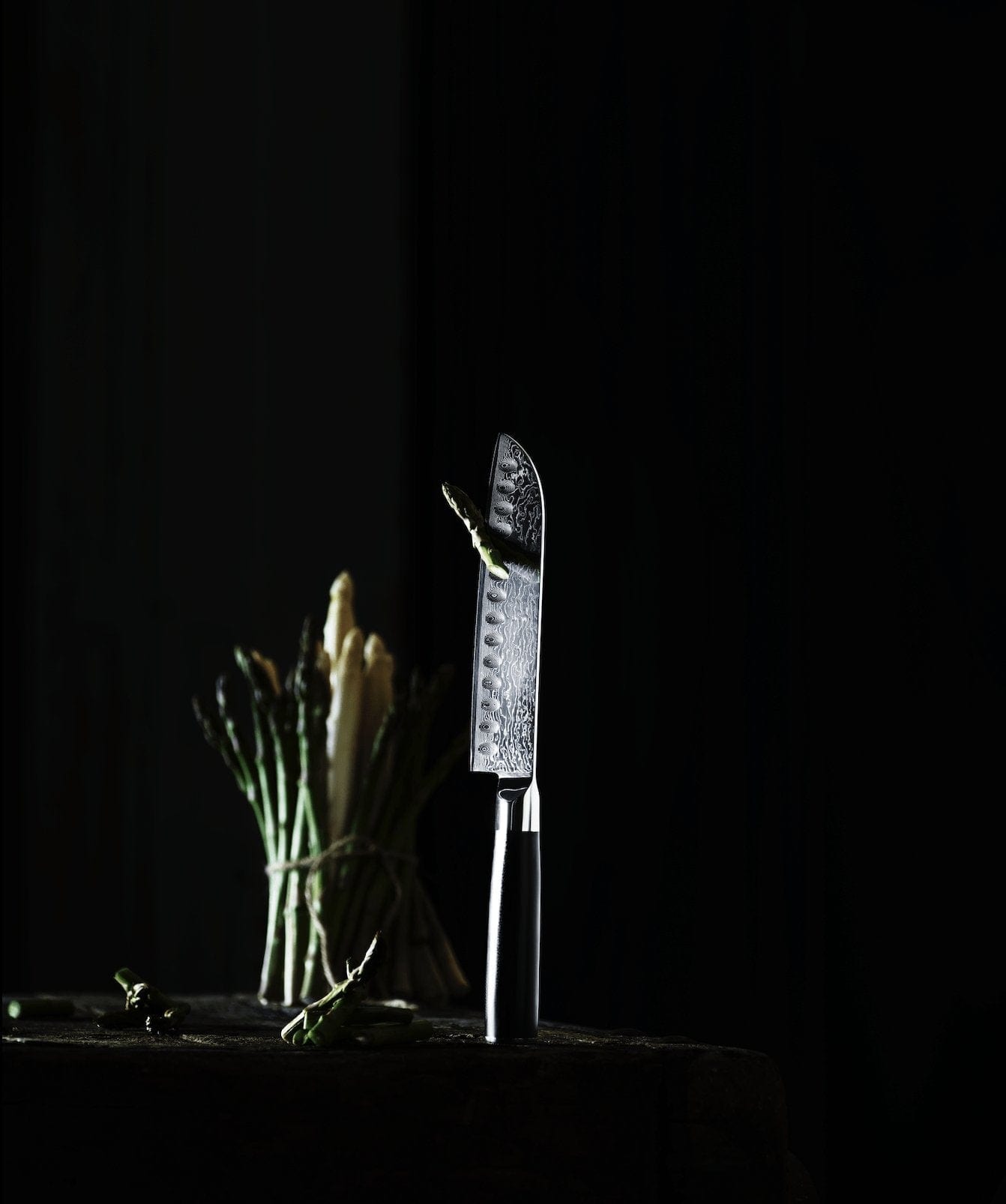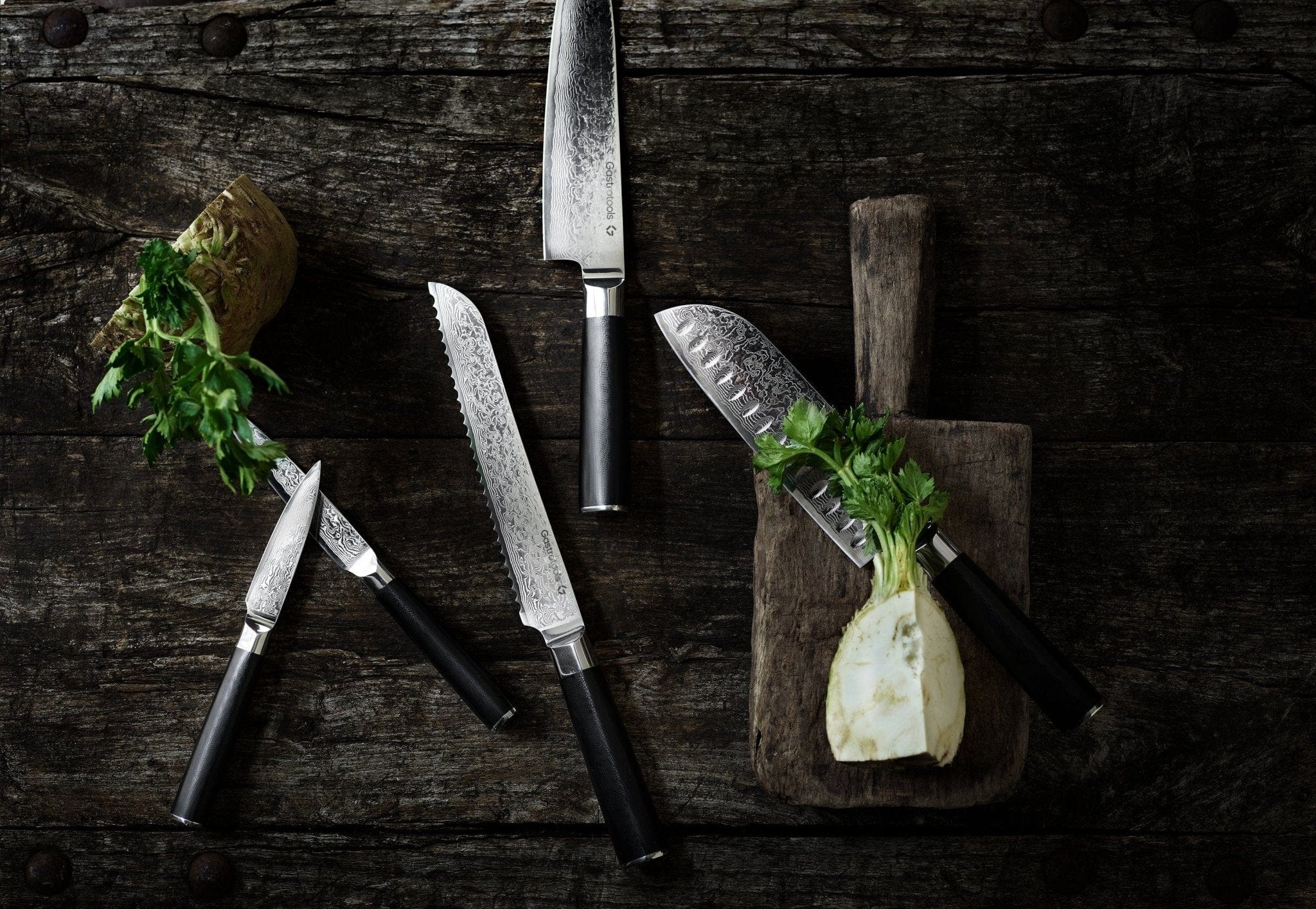 - Includes a Gyuto chef's knife, Santoku chef's knife, bread knife, paring knife, and utility knife
