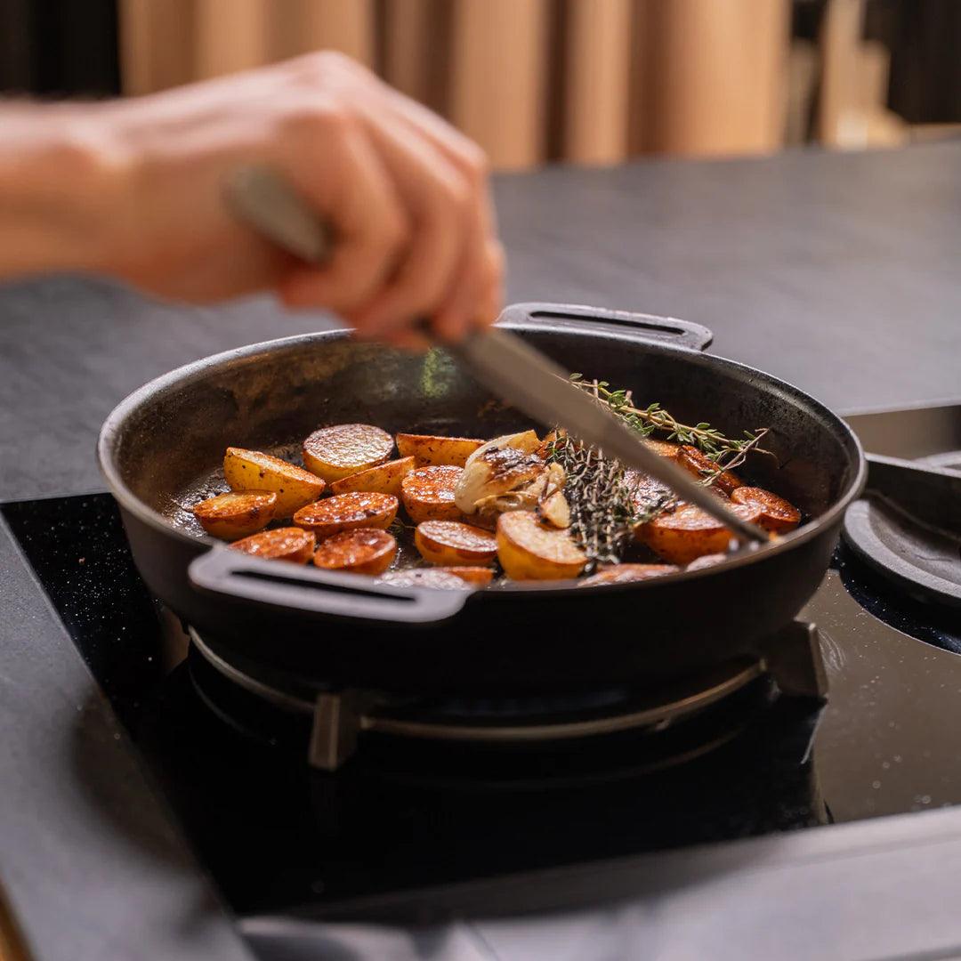 With its material and design, you get an incredibly multifunctional kitchen tool: use the frying pan on the stove for everyday cooking, whether you have induction, gas or ceramic hobs. Take the frying pan to the barbecue in the summer or put it on the fire stand for cooking over an open fire. And you can even use the pan in the oven as a pie dish for both savoury and sweet cuisine.