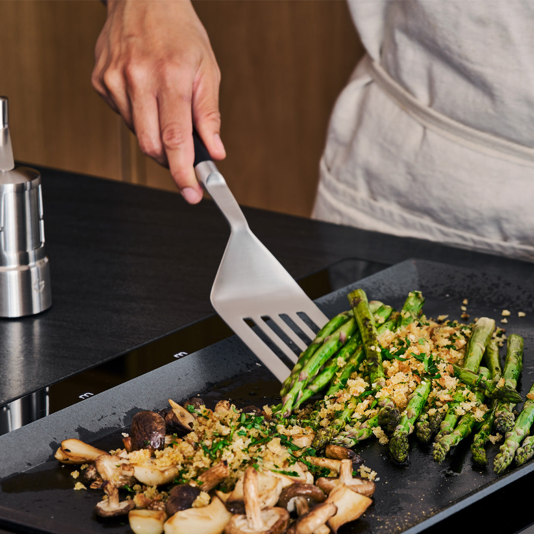The spatula is made of durable stainless steel with a comfortable G10 handle - just like our kitchen knives.