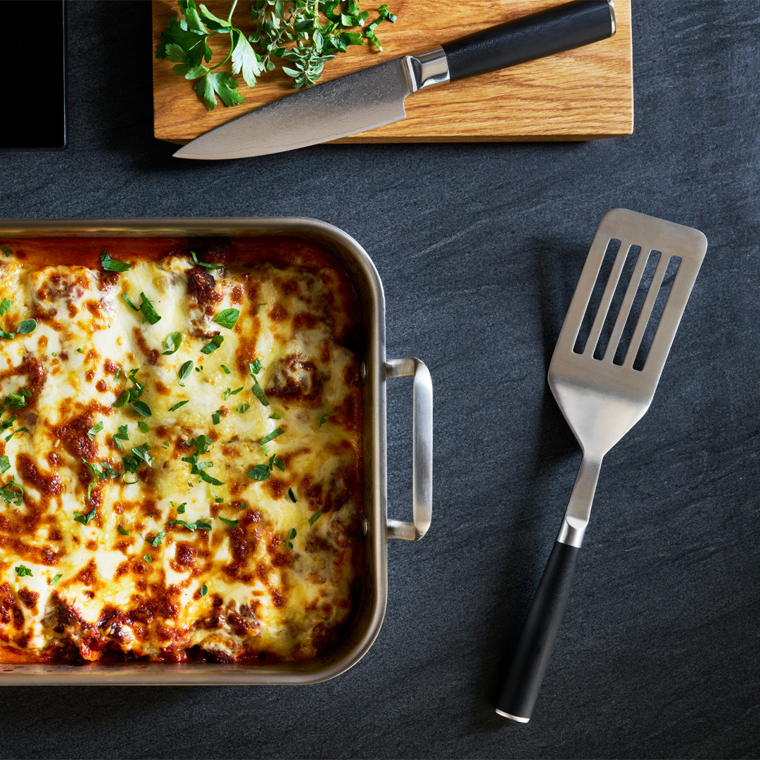 Perfect for flipping everything from sunny-side-up eggs to ribeye steaks. With its thin front edge and ergonomic silhouette, the spatula is also the perfect tool for cutting lasagna or flipping steaks on the griddle.