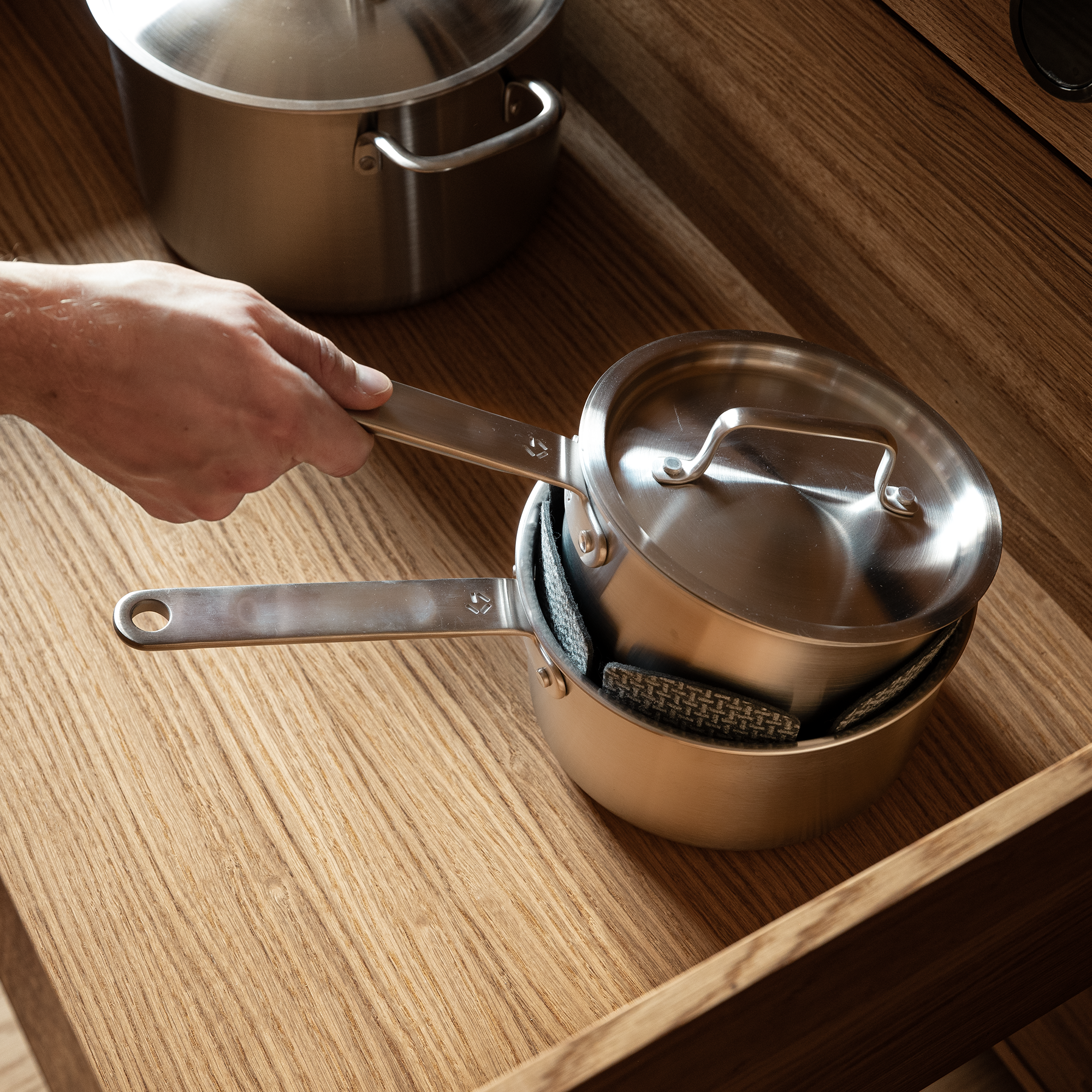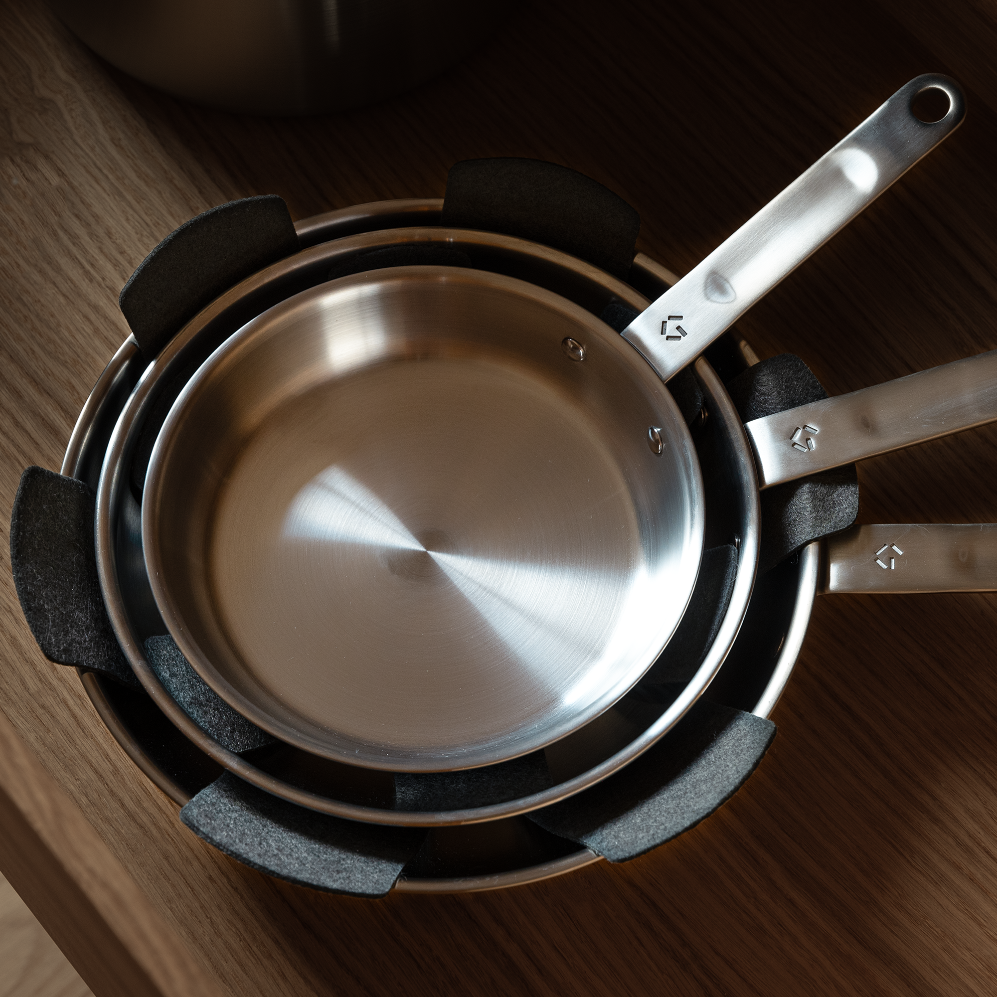 Pan protectors are the perfect accessory for your pans if you store them stacked together. The design is sleek and functional: thanks to the shape of the protectors, they sit at the base of your pans, allowing you to easily stack on top – and you can even use them in pots as well.