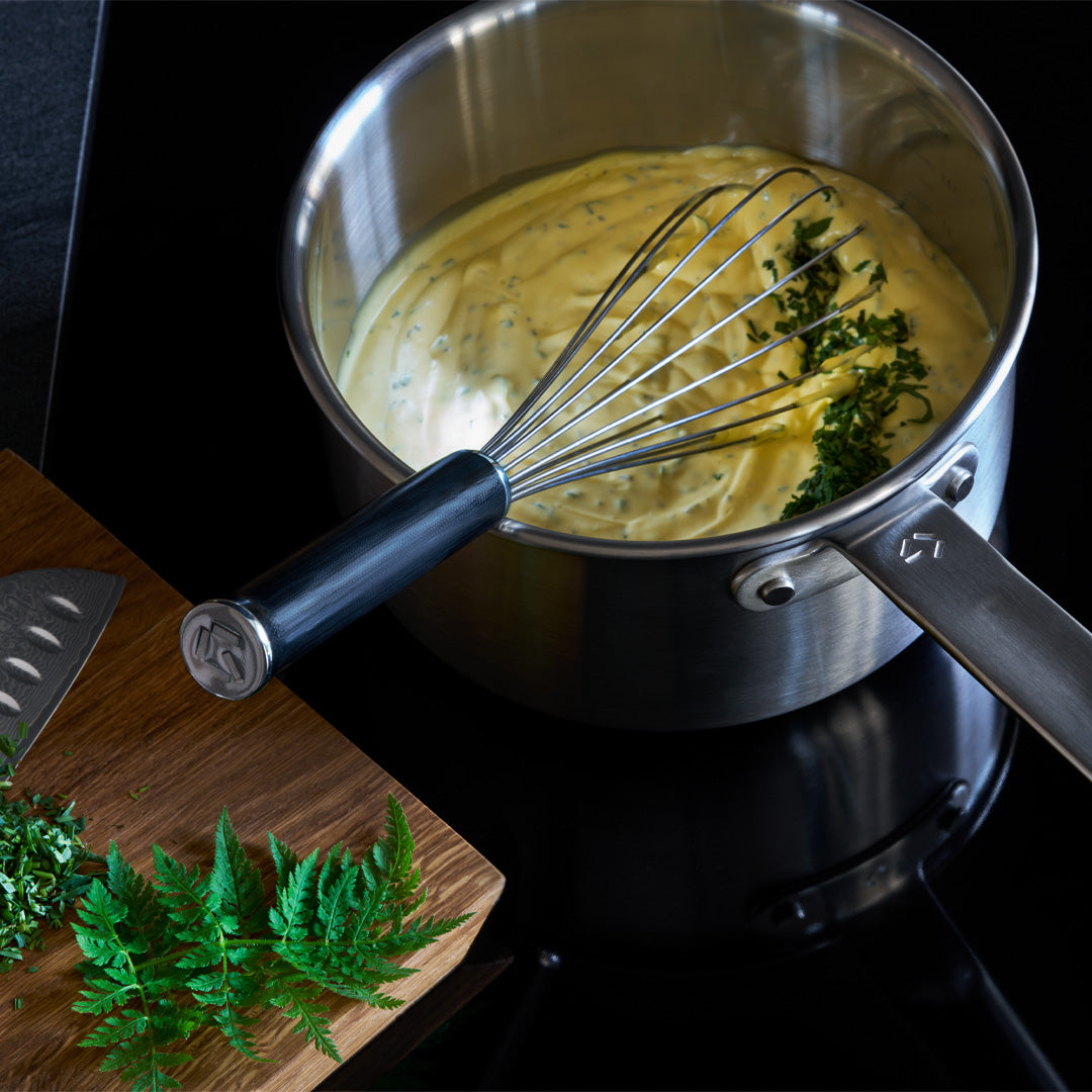 Unlike cheaper plastic or silicone whisks, our whisk is made of stainless steel with a G10 composite handle. This means you don’t have to worry about your whisk melting if you accidentally leave it in the pot—and you can look forward to the best whisking comfort, thanks to the composite handle.