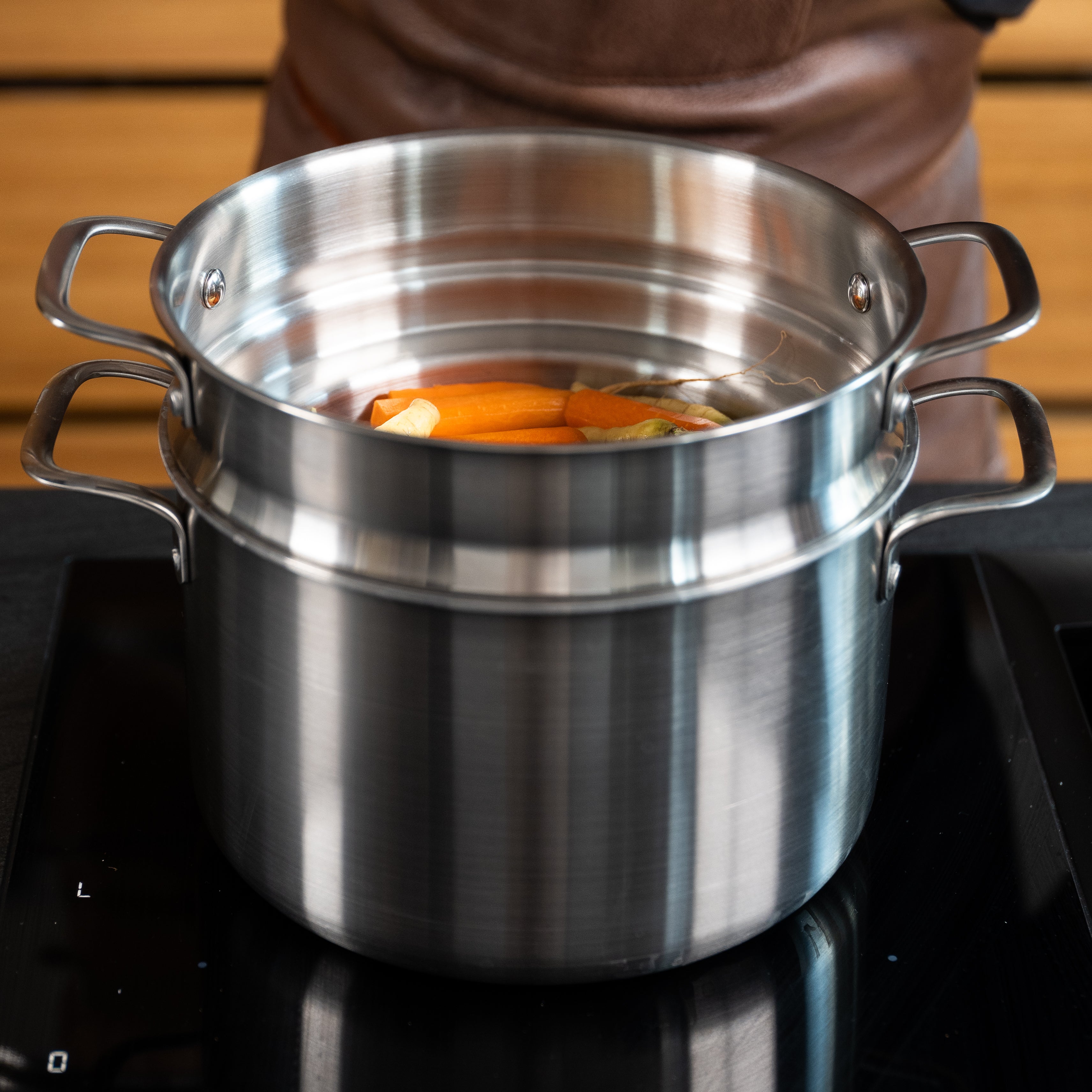 You get effective heat control thanks to the aluminium core, which has excellent heat conductivity and allows you to quickly raise or lower the temperature in the pot. Unlike cookware with a sandwich base, you will find that the heat spreads naturally up the sides of the pot because the entire pot is made of 5-ply – ideal for dishes such as risotto and simmering dishes. The set also includes a steamer insert, which is the ideal upgrade for your 5-ply pot. If you've tried steaming in your pot without a steamer insert, you know it's not an easy task. With a steamer insert, you get a tool designed to make it as easy as possible: boil water in the bottom of the pot and place the insert inside – without burning your fingers. Use it for delicious vegetables, juicy fish or steaming dumplings. Both are handcrafted in Italy by our friends and partners Franco, Mario and Eliano, who carefully produce each product in their family workshop with over 130 years of expertise. It's Danish design, Italian craftsmanship and your guarantee of top-shelf quality.