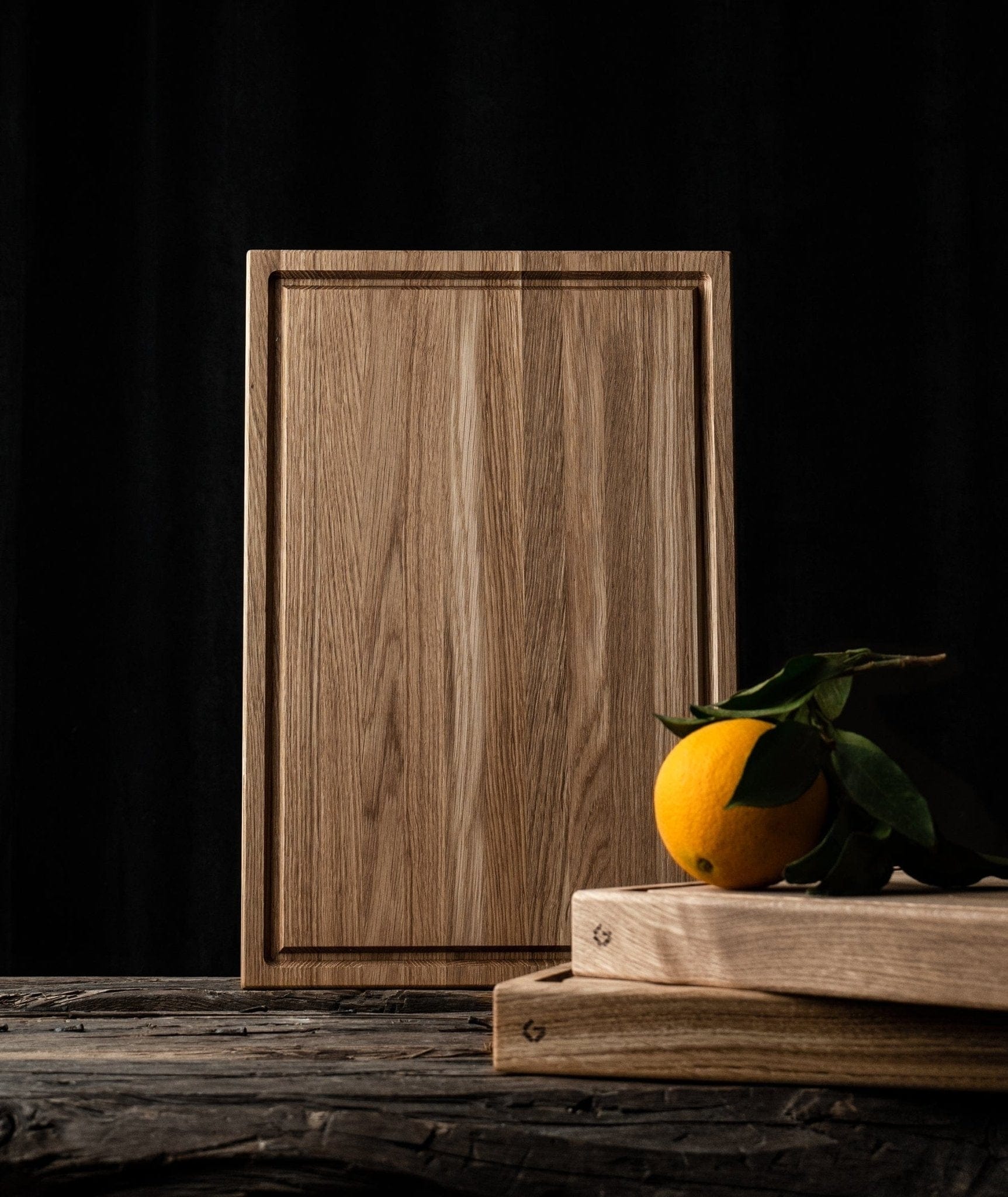 Our cutting board with a juice groove boasts a solid minimalist, timeless design and is bound to become a permanent fixture on your kitchen counter for many years to come. One side is designed to capture juices when you're cutting meat, while the other side is completely flat, making it easy to move chopped vegetables away from the board. The beautiful structure of the solid oak makes this board incredibly suitable as a charcuterie or tapas board.